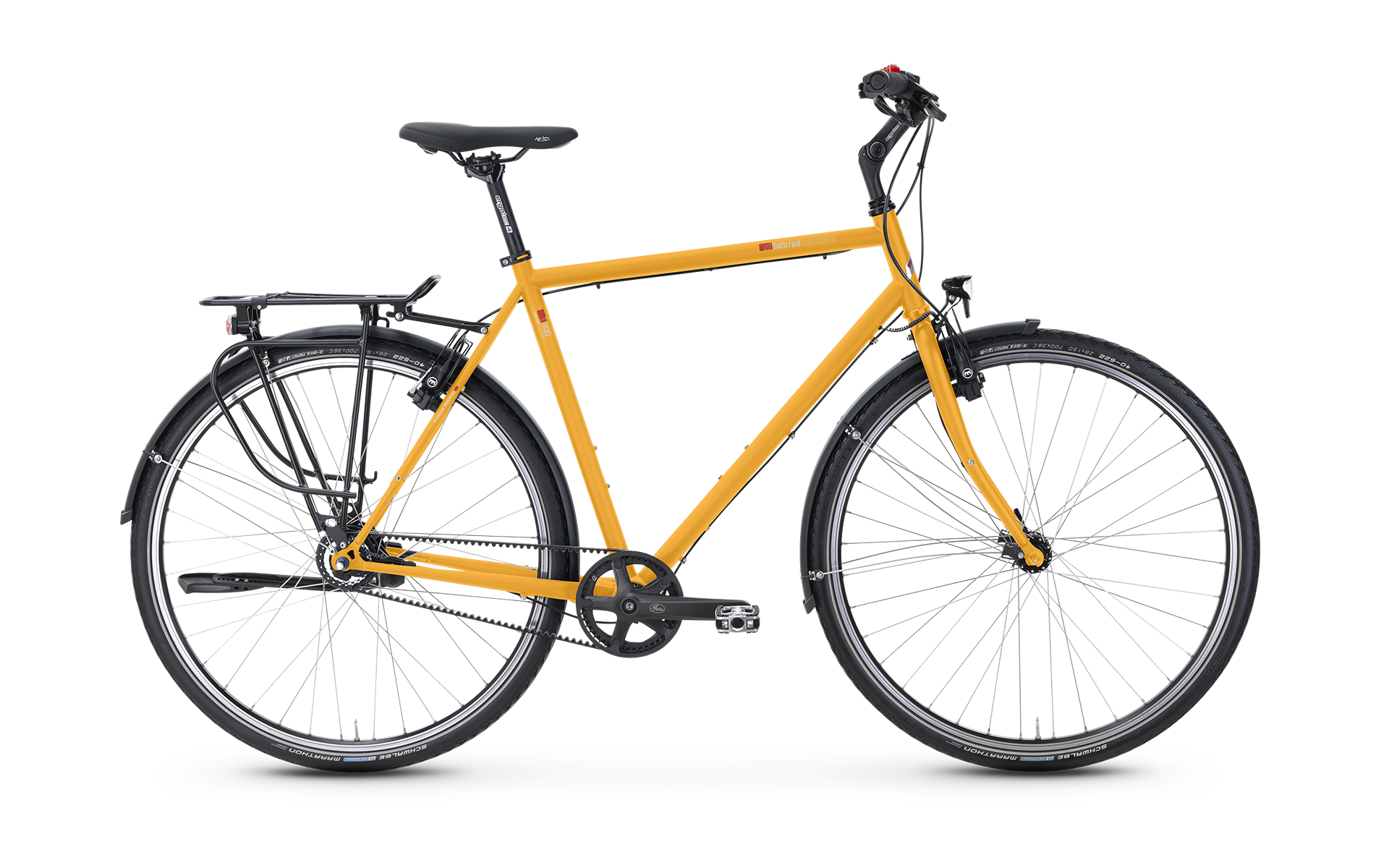 Der handgefertigte und in drei Formen erhältliche Stahlrahmen plus tourentaugliche Gesamtausstattung mit Ergo-Griffen von Herrmans, Racktime-Gepäckträger, Schwalbe Marathon Bereifung und einer LED-Lichtanlage mit Standlicht von Busch & Müller machen dieses T-300-Modell zur perfekten Wahl für ambitionierte Vielfahrer*innen oder solche, die es werden wollen.